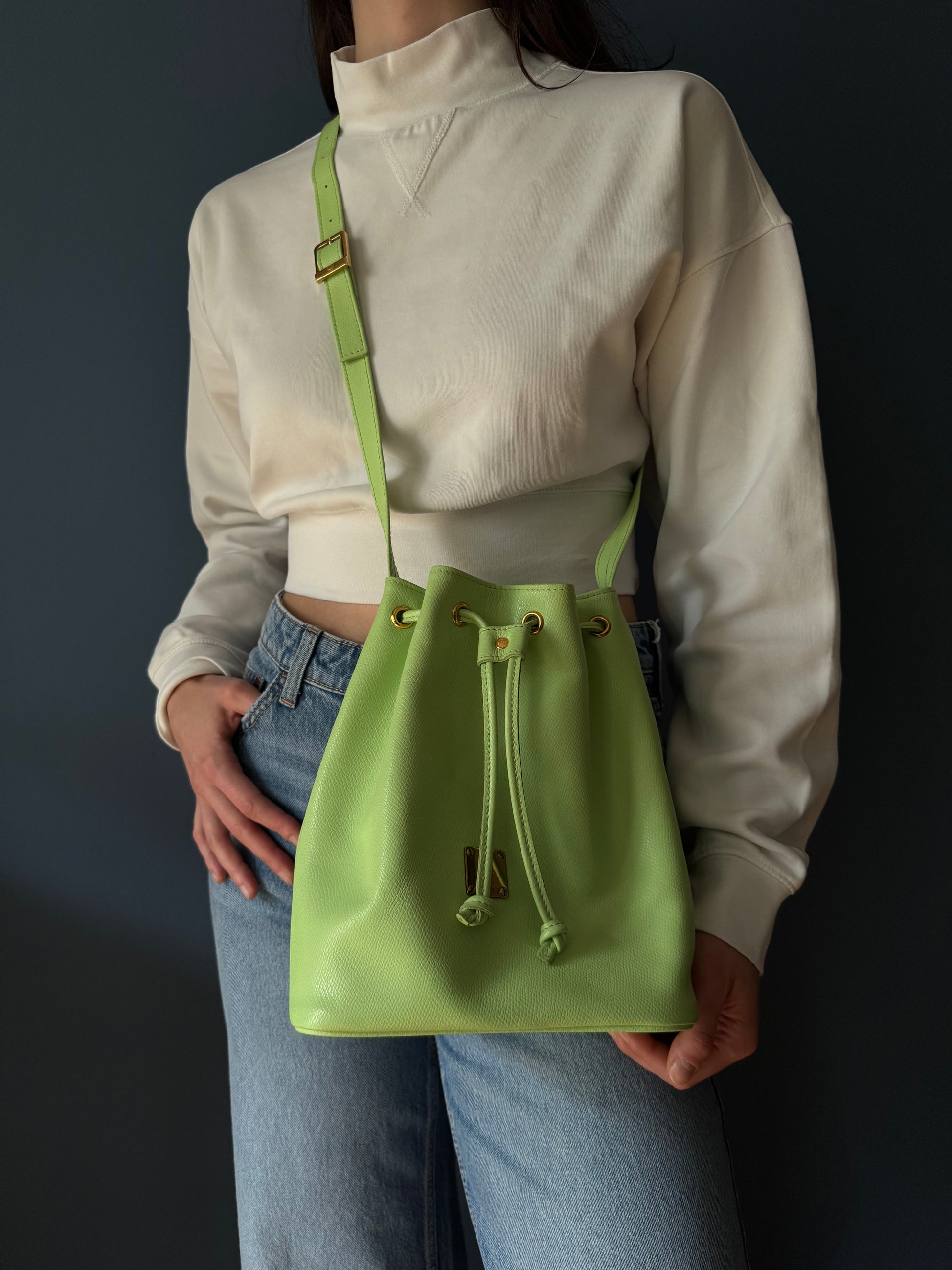 Beschreibung: Stylische MCM Bucket Bag in frischem Grün – ein moderner Klassiker mit ikonischer Frontplakette und feiner Narbung. Der Zugverschluss verleiht der Tasche eine legere, feminine Silhouette. Ideal für den Alltag mit einem Hauch Luxus.